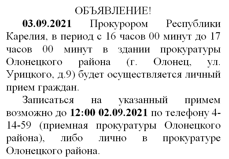 03.09.2021 Прокурором Республики Карелия будет осуществляется личный прием граждан.