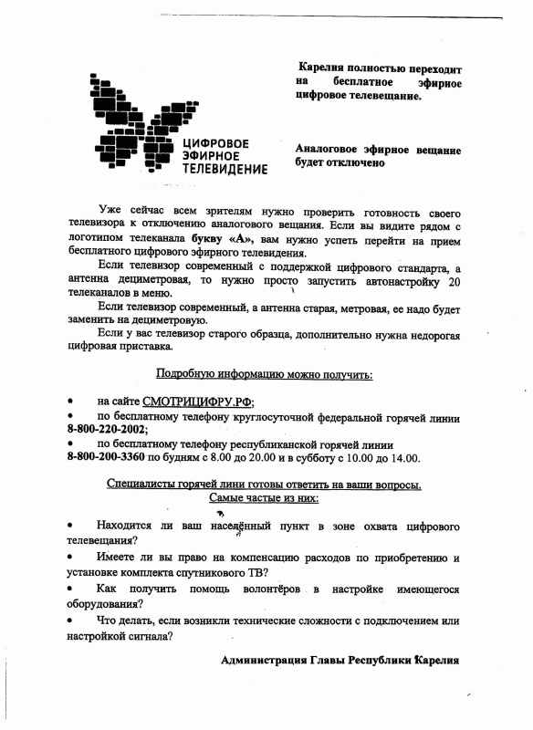 > Памятка Администрации Главы Республики Карелия Об отключении аналогового телевизионного вещания с 14 октября 2019 года