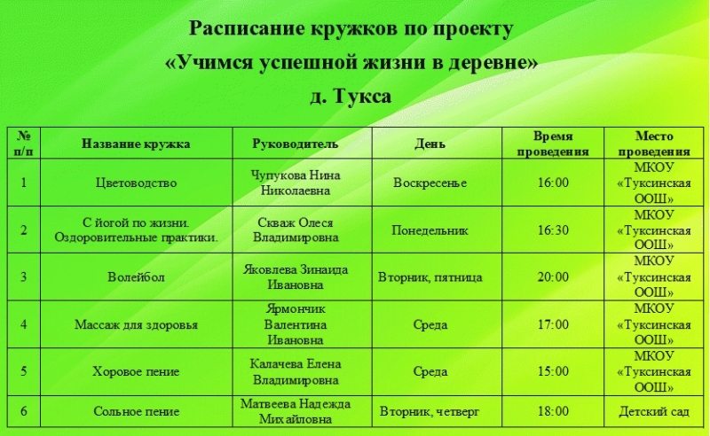 Расписание расписание работы кружков по проекту "Учимся успешной жизни в деревне"