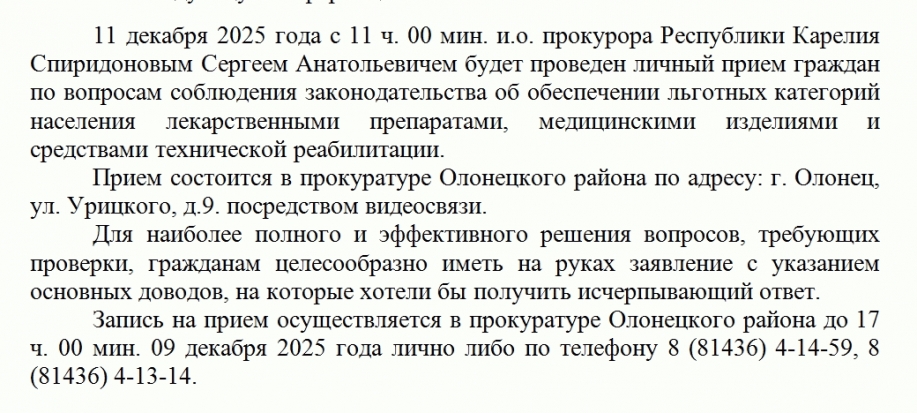 > Администрация > Новости > 11 декабря 2025 года и.о. прокурора Республики Карелия Спиридоновым Сергеем Анатольевичем будет проведен личный прием граждан