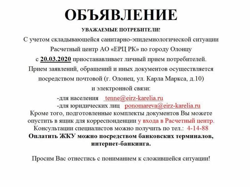 Объявление АО "ЕРЦ РК" по городу Олонцу с 20.03.2020